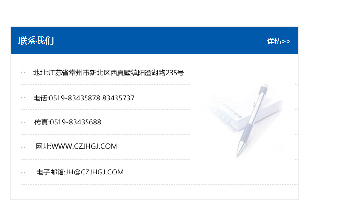 地址:常州市新北區(qū)友邦商務(wù)大廈1幢16、17層  電話:0519-85101652  傳真:0519-85112595  郵編:213022  網(wǎng)址:www.cz-jiayue_cn.qzntjs.com  郵箱:xiajifengaa@163.com